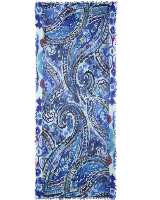 All the blues, with a modest flash of red, to create energy and interest. Embellished with vibrant stitching to add texture and depth and has a 4 sided self fringe to give it that relaxed feel.