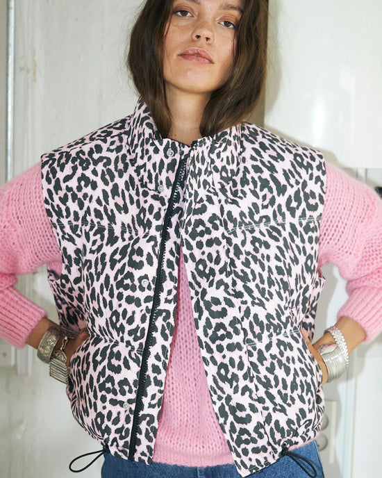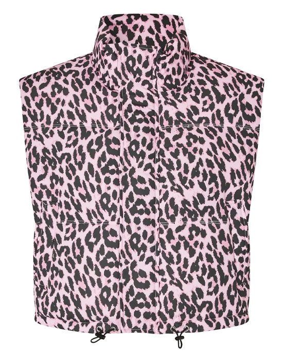 Sada Vest is a quilted layer with standout style, designed in a bold pink leopard print. It features a high collar, a smooth zip closure with an added snap-button placket, and front pockets lined in soft teddy for extra warmth. A drawstring hem lets you adjust the fit to your liking.
