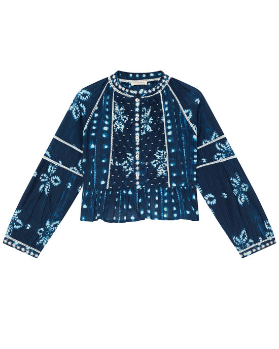 Cropped blouse in shibori-inspired print—midnight navy with sky blue dots and florals. Cut in 100% cotton with smocking at the chest, round neckline trimmed with embroidered flowers. Long sleeves with embroidered cuff details and trim running down the sleeve.