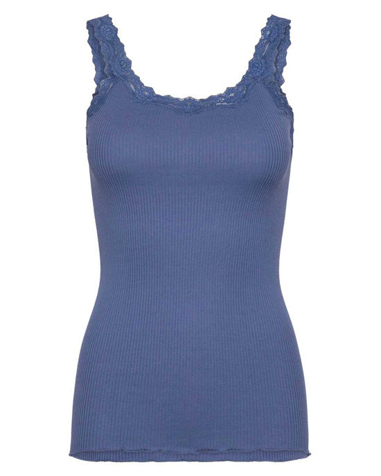 Enhance your wardrobe with this exquisite Rosemunde silk blend lace top in Dutch Blue. Featuring a round neckline, delicate lace straps, and a unique curling edge at the bottom, this tank top is sure to elevate your style. With no side seam, it offers a comfortable and flattering fit. Don't miss out on the opportunity to add this stunning piece to your collection!