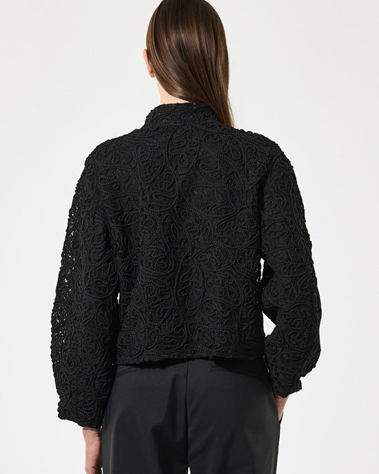 Minimal details on this beautiful jacket allow the stunning black lace fabric make the real statement. Closed with a fly front and snap stud fastenings, the jacket has a stand collar, sculptural sleeves and is cropped to finish at the waist.