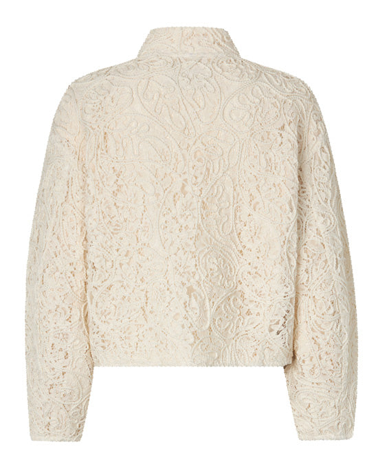 Minimal details on this beautiful jacket allow the stunning cream lace fabric make the real statement. Closed with a fly front and snap stud fastenings, the jacket has a stand collar, sculptural sleeves and is cropped to finish at the waist.