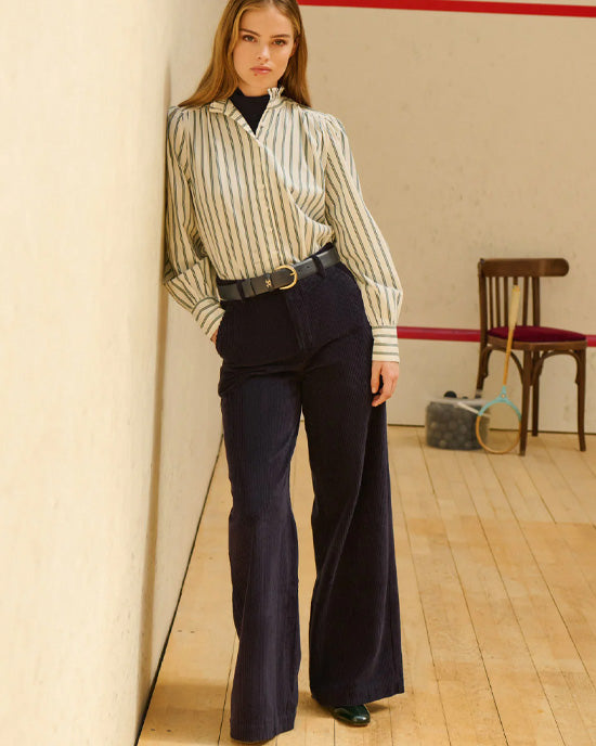 The Petite Mendigote Pedro navy Cord Trousers are a flattering high-waisted style with a wide-leg cut. Crafted in soft corduroy in a navy tone, they combine comfort with retro-inspired elegance. Easy to style with knits, blouses, or tees, they’ll bring effortless charm to your everyday wardrobe.