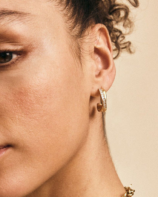 The classic Andorra line has a softer design thanks to its two rounded rails wrapped around each other; one with clear stones and the other without. Elegant larger creoles that suit everyone and make an ideal gift. Andorra Creoles Duo L can be seen here in shiny 14K gold plating.