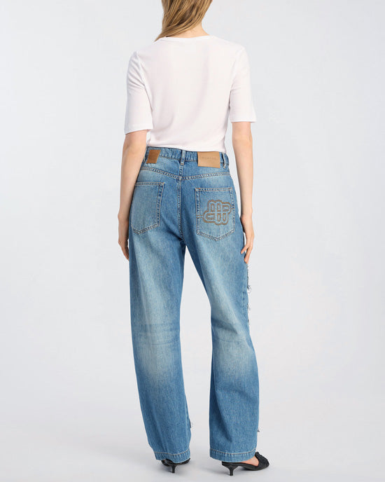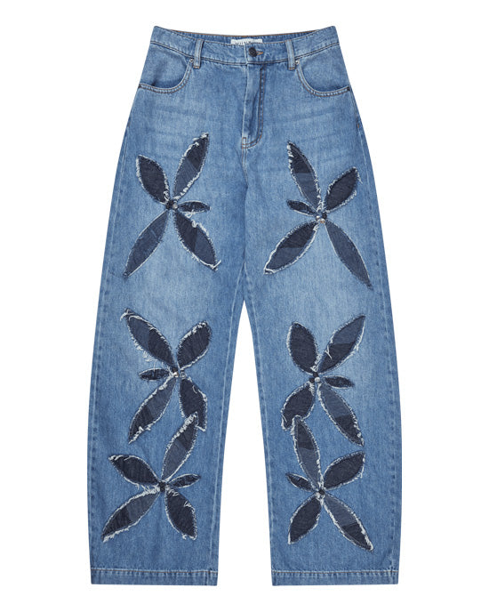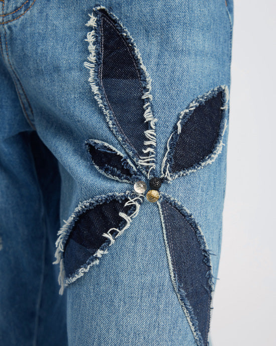 Enhance your daily wardrobe with the Bimo Jeans from Munthe, featuring large appliquéd floral motifs on the legs, cut in contrast denim. Made from a classic denim which is crafted from an eco-friendly cotton blend with straight legs, five pockets and a zip closure, the back pocket features the Munthe emblem top-stitched for added detail. Keep it simple on top with a plain jumper or t-shirt and pair with loafers or ballerinas for an easy yet stylish weekend outfit.
