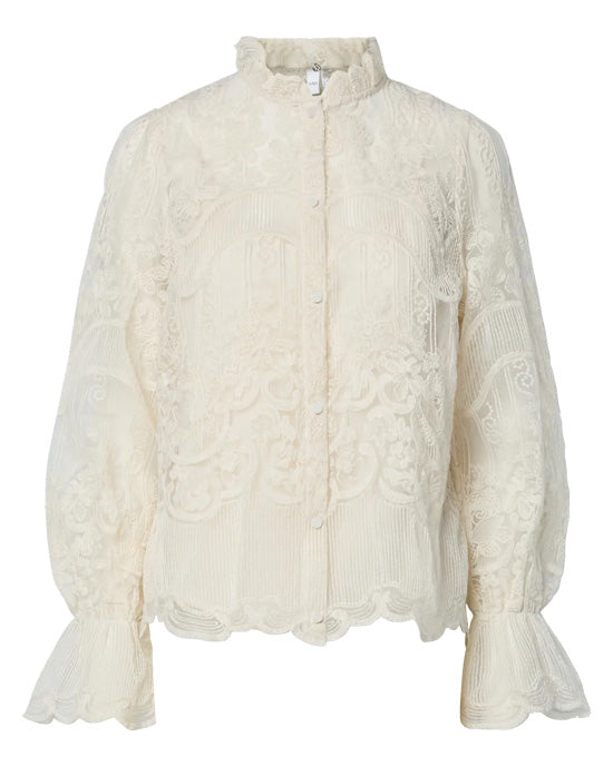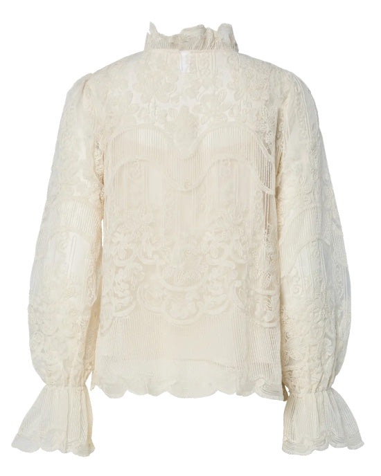 This romantic lace blouse brings timeless elegance to any outfit. Designed in a soft off-white tone, it features intricate embroidery, scalloped edges, and gently flared cuffs for a feminine silhouette. The high neckline and delicate button-down front add a refined touch, making it perfect for both casual days and special occasions. Pair it with tailored trousers or denim for an effortlessly chic look.