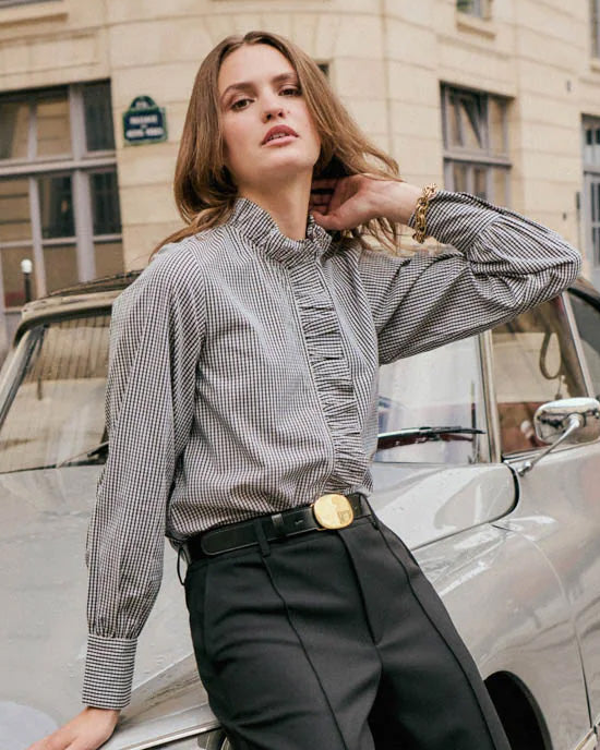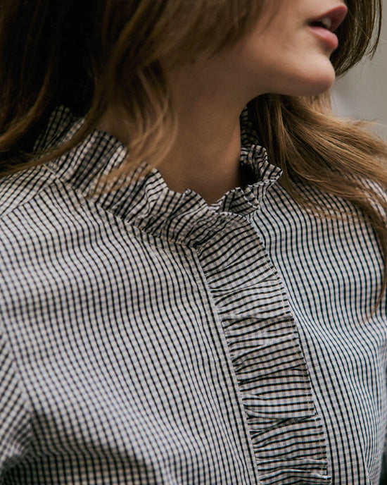 A modern take on vintage charm, the Talcy blouse is cut in a straight silhouette from organic cotton with a timeless gingham print. It features a Victorian-inspired high neck with delicate ruffles that also trace the button placket, adding a feminine touch. Long sleeves with buttoned cuffs complete the look, making it a versatile piece for both casual and elevated styling.