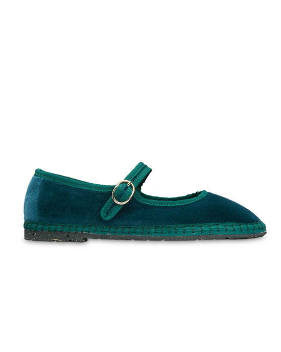 • Velvet mary jane in dark green with dark green piping and buckle closure.