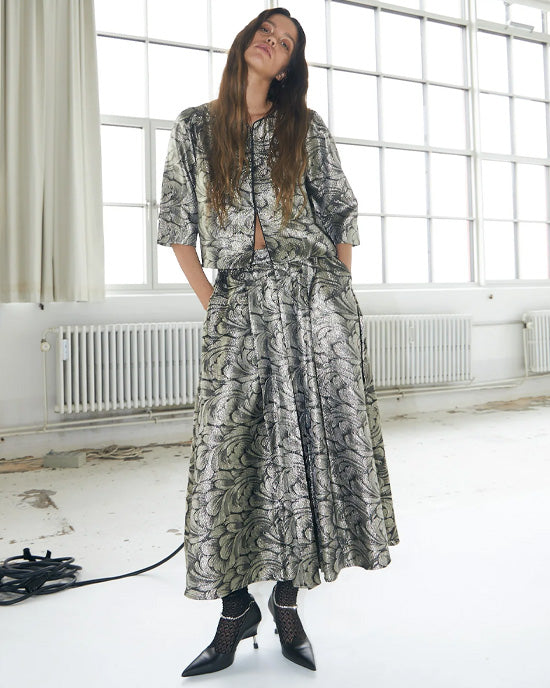 The Catalina Skirt is a true statement piece, perfect for autumn celebrations. Crafted from an exclusive jacquard-woven fabric with a metallic finish, it brings a luxurious touch to any look. The gentle A-line silhouette offers a flattering, elegant drape. Pair it with the TrineLL jacket for a coordinated set, or style it with a simple knit or classic shirt for a more relaxed yet refined outfit.