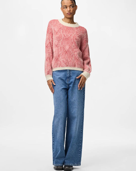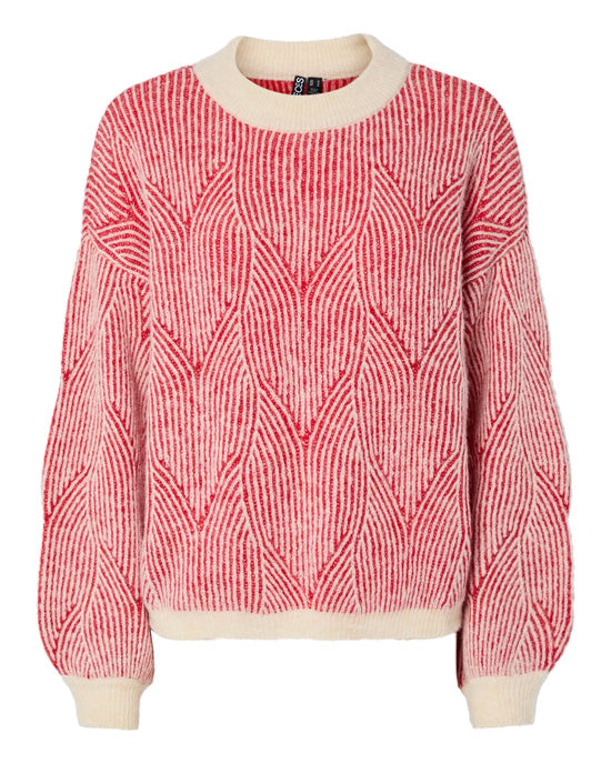 A cozy, eye-catching sweater featuring a bold red and white knit pattern. Designed with a classic crew neck and ribbed cuffs and hem for a snug fit—perfect for chilly days.