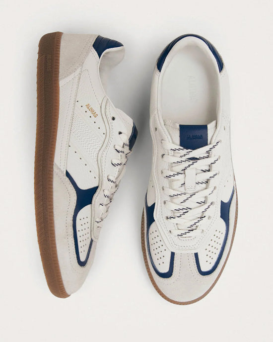 The Tb.490 sneaker in white and navy is crafted from white tones with mixed textures—suede at the toe and back, and leather at the center. Contrasting navy trims add definition, while marbled laces in matching tones complete the design. Designed in a low-top silhouette sitting on rubber soles, it features classic details like exposed stitching and an embossed logo on the tongue and sides.