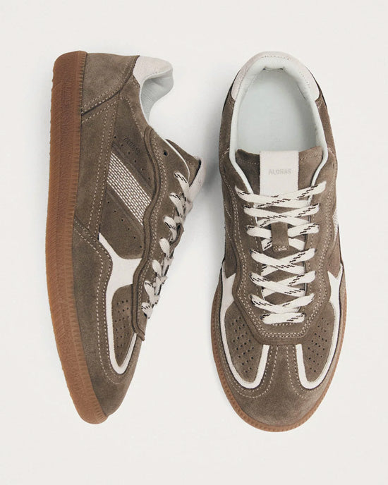 The Tb.490 sneaker is crafted entirely from taupe suede. Contrasting cream leather trims add subtle contrast, while tonal laces with black stripes complete the design. Designed in a low-top silhouette sitting on rubber soles, it features classic details like exposed stitching and an embossed logo on the tongue and sides.